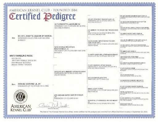 Puppy’s Grandpa, Roses Sire: Rascal is a Dual Champion bred at Rick Hasting’s DC Brittany’s kennels in Chanute, Kansas. He has demonstrated consistent excellence in both field and show arenas, earning his AFC title at two years old and securing his show championship with wins in 7 out of 9 entries. Rascal’s credentials include 17 field trial placements and a third-place finish in the National Shooting Dog Championship at just two years of age. Noted for his exceptional appearance and conformation, Rascal descends from a lineage of accomplished field and show dogs. His pedigree includes: NAGDC GCH DC AFC Triumphant’ s Too Hot To Handle, NFC DC AFC Gambler’s Ace In The Hole, NGDC 2X DC AFC Winchester Of Hanging Jaze, NGDC DC AFC Magnum’s Masked Man, DC AFC Masked Shoshoni War Chief, and NFC DC AFC Ru-Jem’s A Touch of Bourbon.