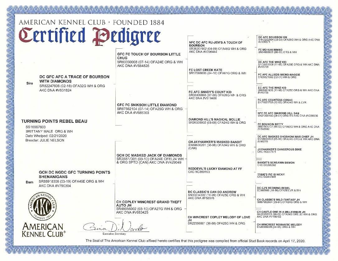Puppy’s Granddad, Beau’s Sire: DC GFC AFC A Trace of Bourbon with Diamonds, owned by Rick Hastings, is an AKC All Age Open dog with numerous FC and AFC wins. His pedigree features many Brittany field trial champions, including DC AFC Masked Shoshoni War Chief, FC AFC Candy’s Lucky Penny, NFC FC AFC Hi Proof Rum Runner, NGDC DC AFC Magnum’s Masked Man, NAFC DC AFC Renegade’s Kansas Kid, NFC FC Beans Blaze, and others.