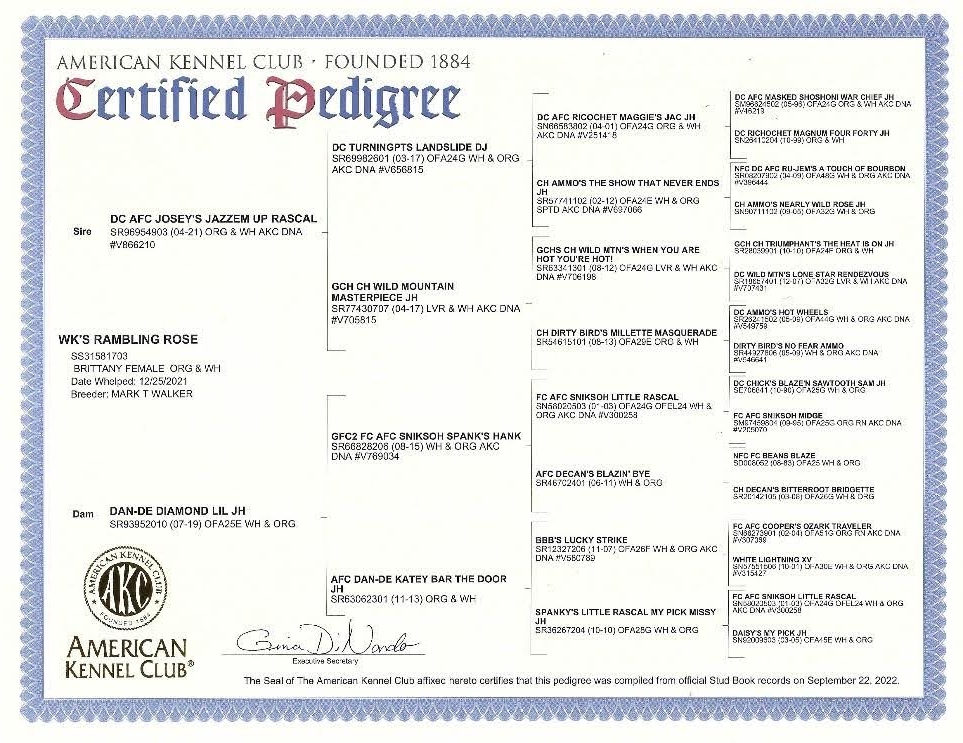 Her Dam: Rose exhibits all the traits of an exceptional bird dog. She has desire, boldness, independence, bird-finding ability, pointing style, and trainability. Rose is calm both in the kennel and at home, making her a joy to be around. She has been trained and hunted with various dogs and handlers, earning her AKC Junior Hunter title at 9 months of age under the guidance of Amy West. She is OFA Good.  Her pedigree boasts a lineage of distinguished performers and show winners, including NAGDC GCH DC AFC Triumphant’ s To Hot To Handle, NFC DC AFC Gambler’s Ace In The Hole, NGDC 2X DC AFC Winchester Of Hanging Jaze, NGDC DC AFC Magnum’s Masked Man, DC AFC Masked Shoshoni War Chief, and NFC DC AFC Ru-Jem’s A Touch of Bourbon, FC AFC Sniksoh Spank’s Hank, whose littermate was NFC Roustabout’s Flat Out. Her pedigree includes NFC FC (HOF) Beans Blaze, NFC DC AFC Gambler’s Ace In The Hole, FC AFC (HOF) Blaze Dakota Trucker, FC AFC Chubasco II, and DC Chick’s Blaze’N Sawtooth Sam. (See her pedigree in pics)