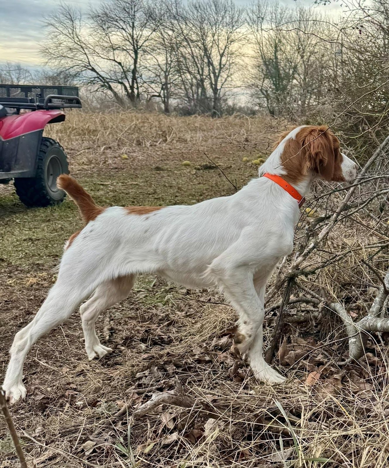 Stella was whelped here at the kennel and has been in training since a puppy with 6 to 7 days a week in the field. She’s developed an intense desire to seek and find game, point staunchly and has been exposed to various field scenarios and hunting situations. She is familiar with the gun, retrieves naturally, e-collar conditioned, whistle trained and socialized with other dogs and hunters. She is current on all vaccinations and heartworm. She is excited, eager and ready to hunt!